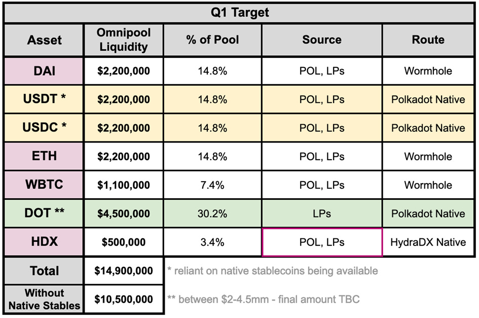 Nasadenie POL je iba časťou našej stratégie, ako prilákať likviditu počas Q1. Našim skromným cieľom je mať niekde medzi 10M USD a 15M USD TVL v Omnipoole do konca marca. Nižšie nájdete hrubý rozpis aktuálneho plánu: